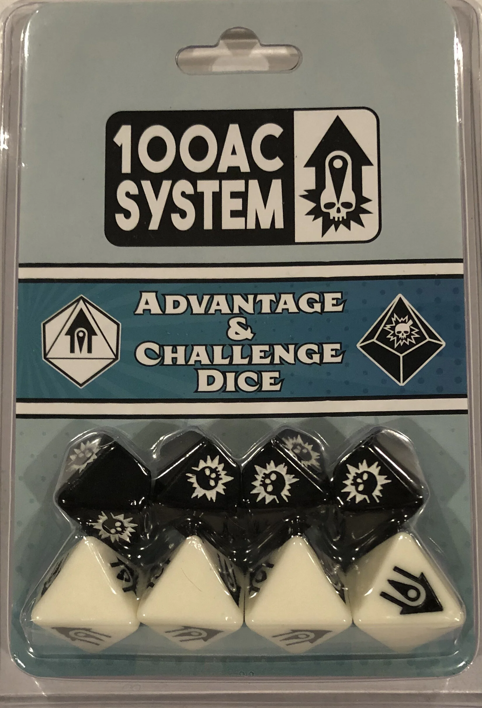 This dice pack includes 4 advantage dice and 4 challenge dice, the standard suite of custom dice used by 100AC System games like Neon City Outlaws.